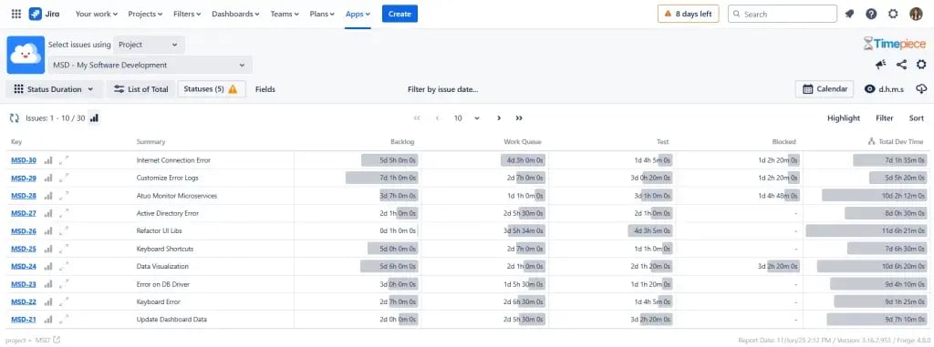 A big advantage of Timepiece is that it delivers value right away. Because the app uses existing issue history, it can generate accurate reports on all your past issues the moment it’s installed. You don’t have to wait to collect new data.