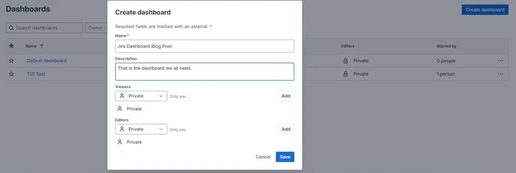 First, ensure the Timepiece – Time in Status for Jira app is installed on your Jira instance. Once the app is ready, navigate to the dashboards section by selecting Dashboards from your Jira navigation bar. From there, select Create dashboard and provide a descriptive name and a clear description so your team understands its purpose.