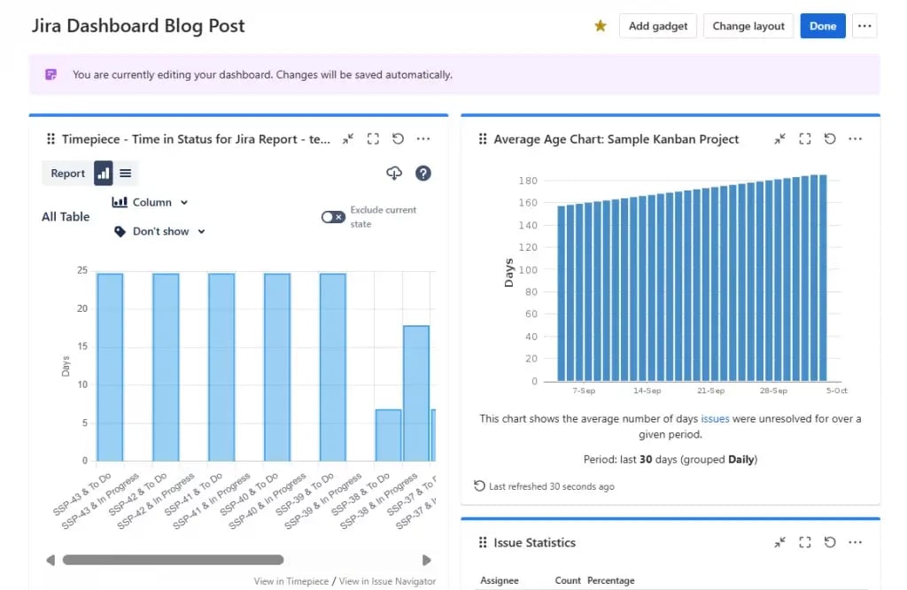 Jira is an incredible tool, but when it comes to in-depth Time in Status reporting, its native features sometimes fall short. For instance, its “Average Time In Status” gadget tracks the average time an issue spends in a selected status, but it only does so for issues that have been resolved within the last 30 days.