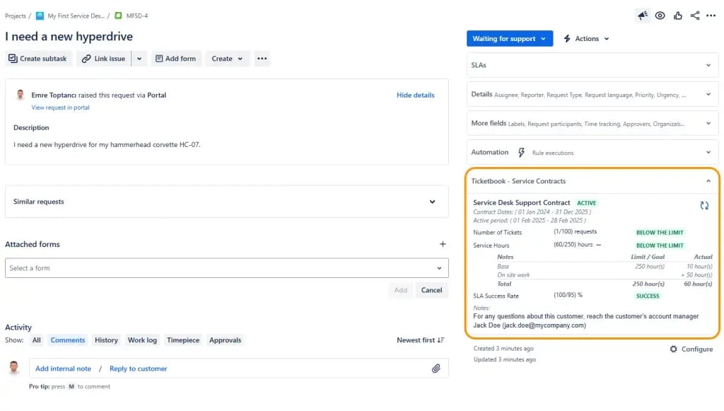 While Jira is the system of record for service requests, its native capabilities for managing the financial and service-level terms of a contract are limited. This is exactly why we built TicketBook – Service Time and Contract Management for Jira. It’s designed to close the gap between the agreement and the work by turning your contracts into living, automated parts of your Jira workflow. Here’s how it creates a shared source of truth: