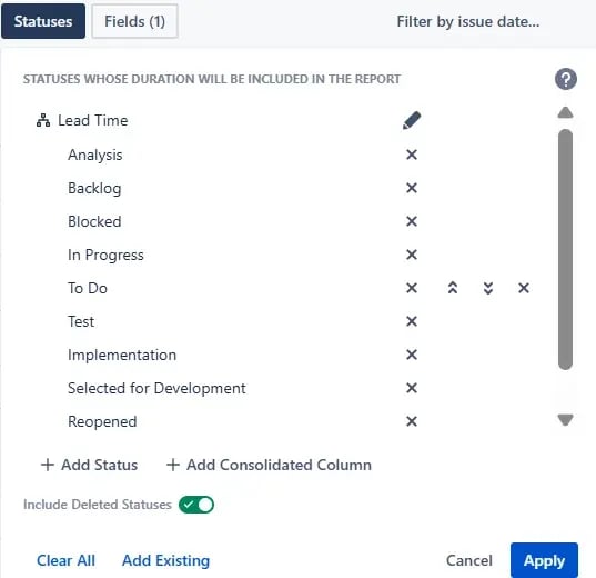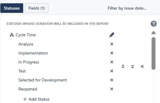 - Name it “Cycle Time” and select your “active” statuses into it.