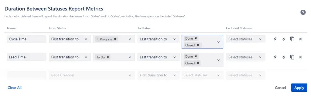 For Lead Time, set the From Status to your backlog (e.g., To Do) and To Status to your end point (e.g., Done)