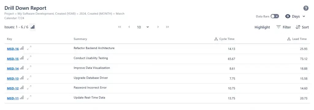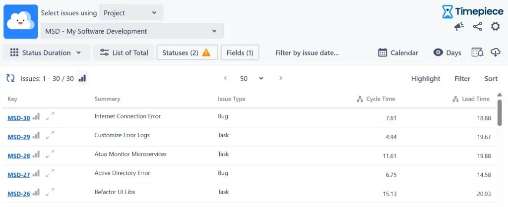 Once you click ‘’Apply’’, you’ll get a report showing numbers. For example, issue MSD-29 has a Cycle Time of 4.94 days and a Lead Time of 19.88 days.