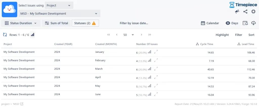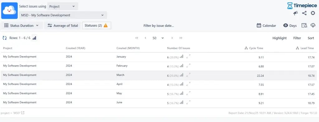 But what if one week, the average jumps to 20 days? This is where the report’s context is key. The Number Of Issues column might show “1” or “2.” This tells you the problem isn’t the whole team; it’s a single outlier issue that got stuck.