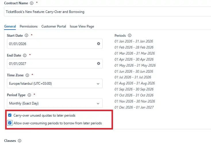 When you turn this on, TicketBook looks at what you didn’t use in the current period and moves it to the next one. Here is a simple example: If you have 100 hours but only use 80, the remaining 20 moves to next month. The math is simple: next month, you have 120 hours. And it doesn’t stop there; the quota keeps carrying over and accumulating until the end of the contract.