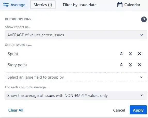 Navigate to the Report Options panel and change the report type from List to Average. This tells Timepiece to calculate the average time instead of listing individual issues. Finally, use the Group By dropdown menu and select Story Points and Sprint.