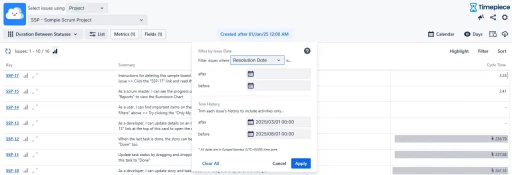 Timepiece’s Trim History feature solves this problem. It allows you to set a start and end date, effectively trimming the history of each issue to only include activities within that period. This creates a clean, relevant dataset.