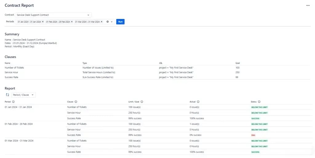 TicketBook gives you the visibility you’ve been missing. You can define contracts, clauses, and service periods directly inside Jira Service Management. You can set: